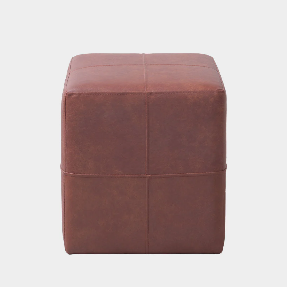 A Mid-Century Modern square ottoman with stitching in leatherette and kiln-dried tanguile wood with plywood frame.