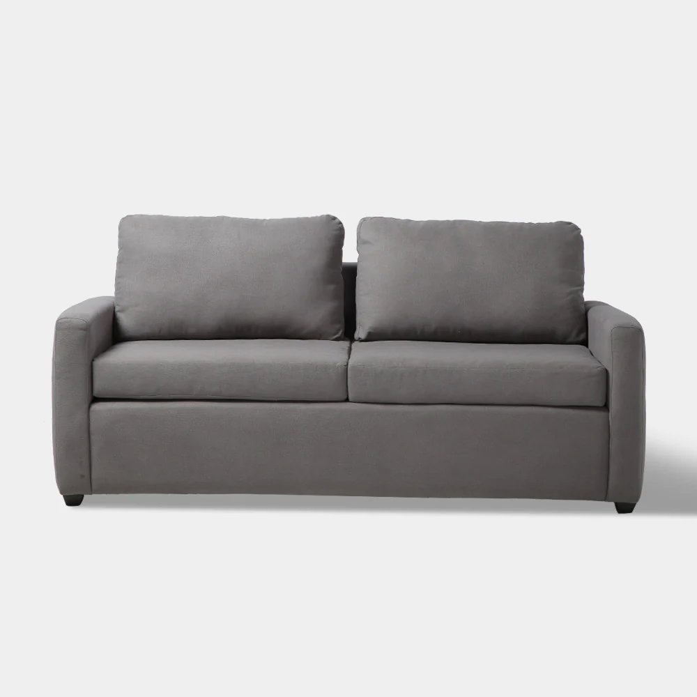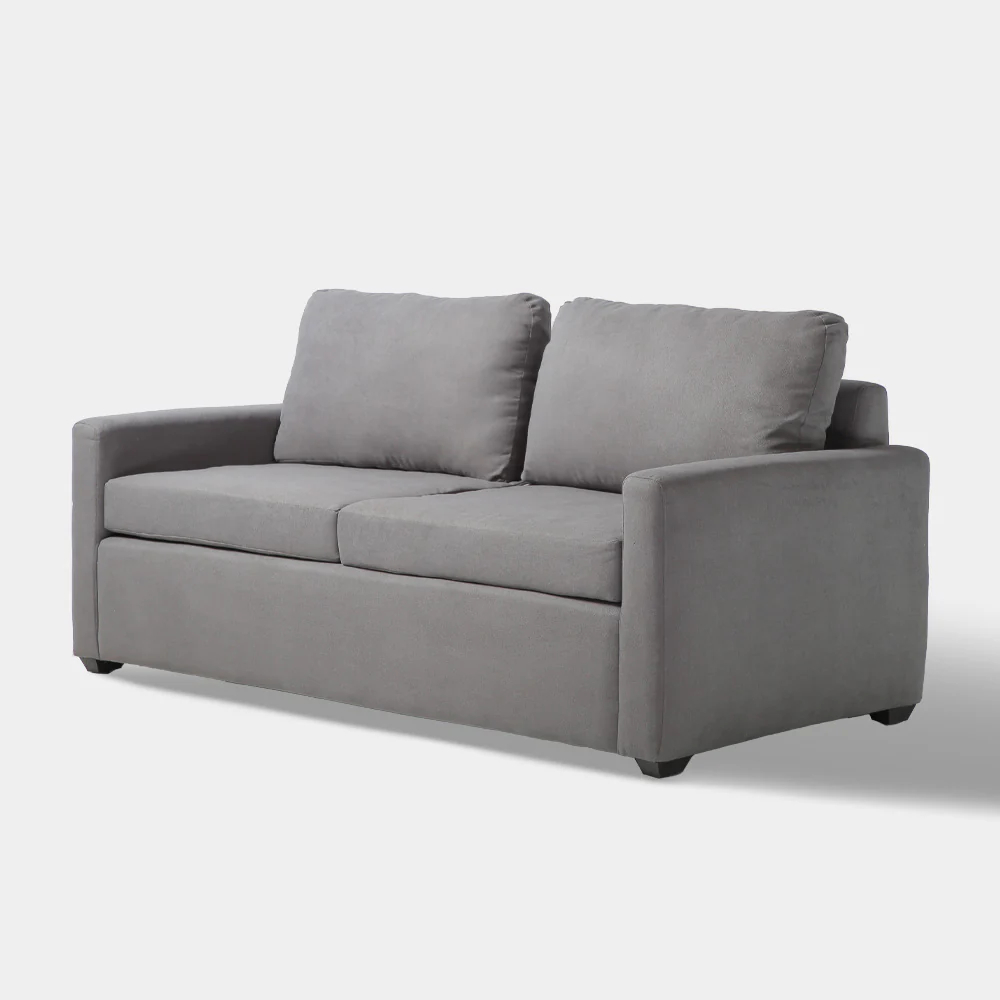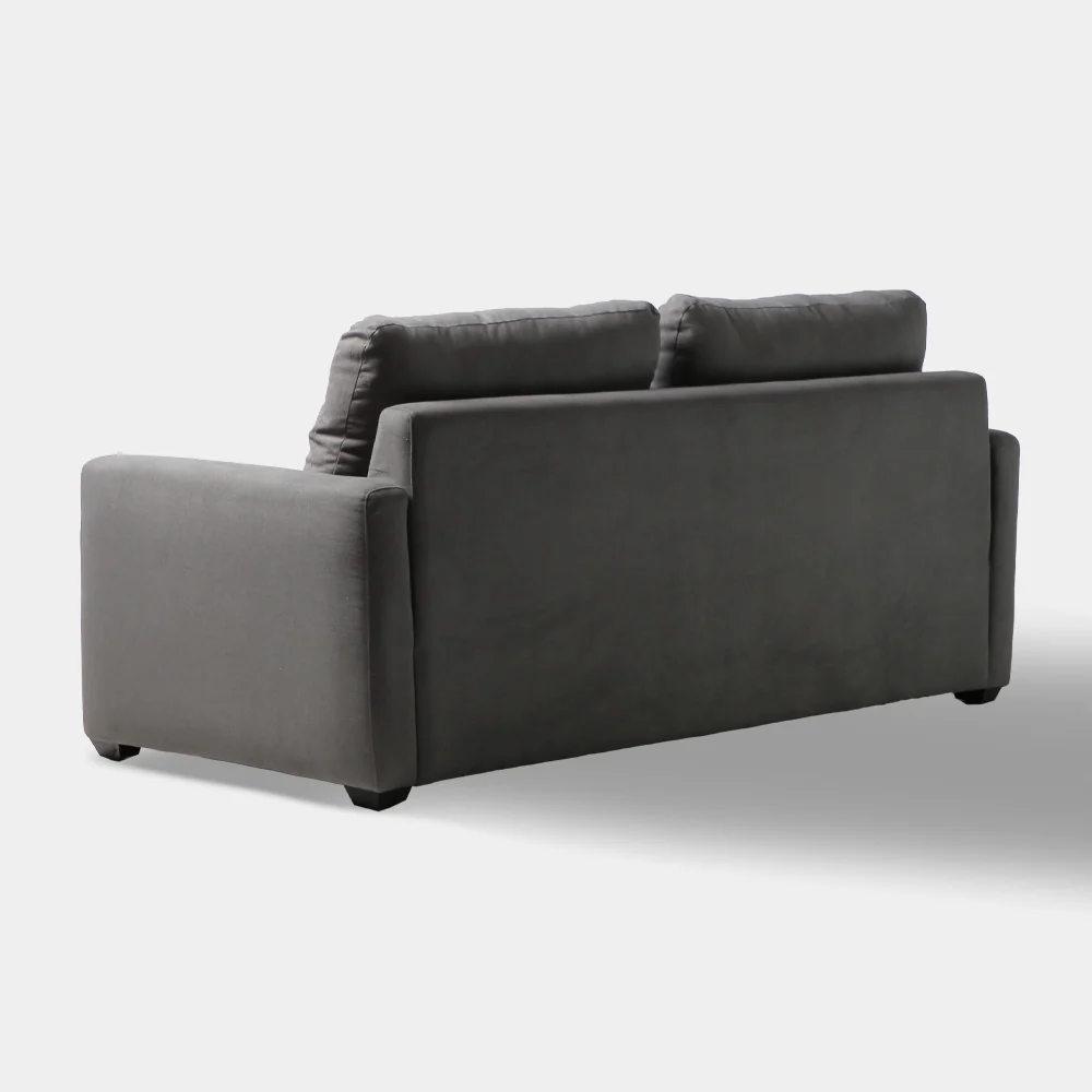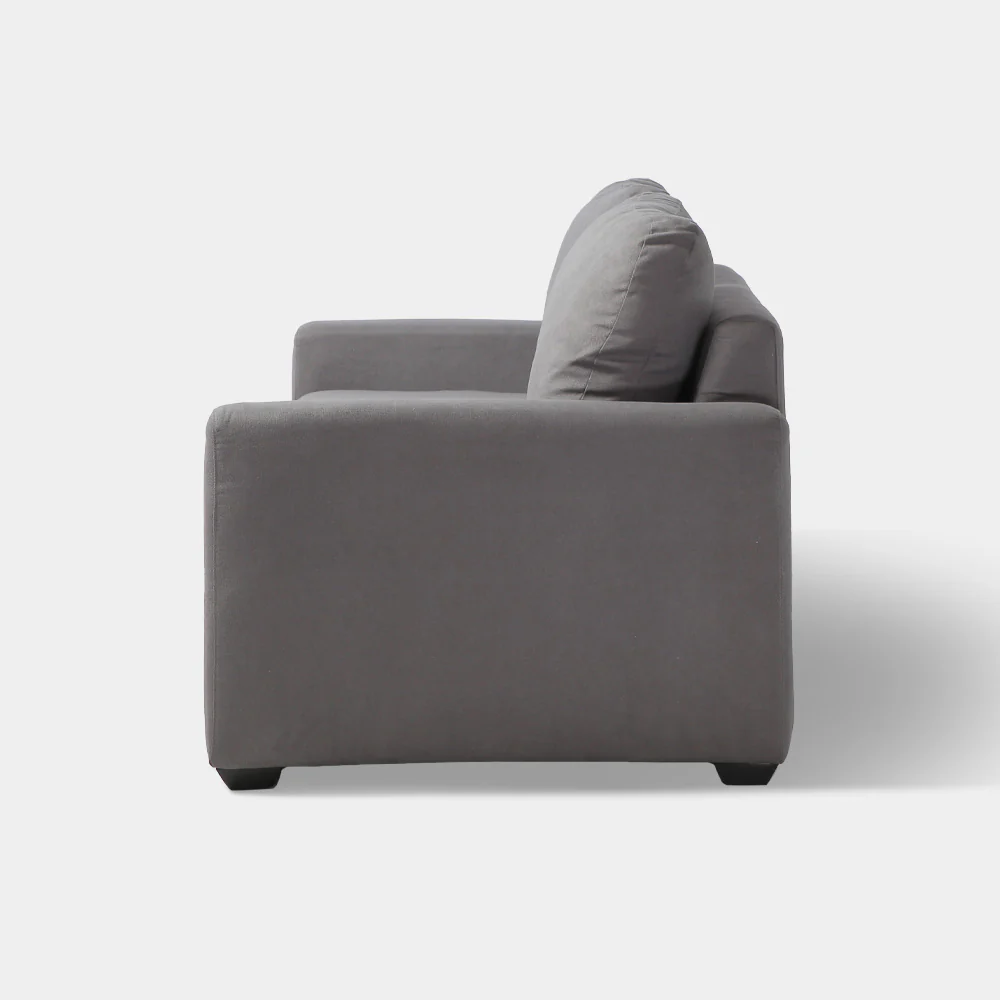 A Modern Contemporary style sectional sofa, made from solid kiln dried gmelina wood, padded in polyurethane foam and upholstered in chennile textured fabric, with black powder coated steel legs.