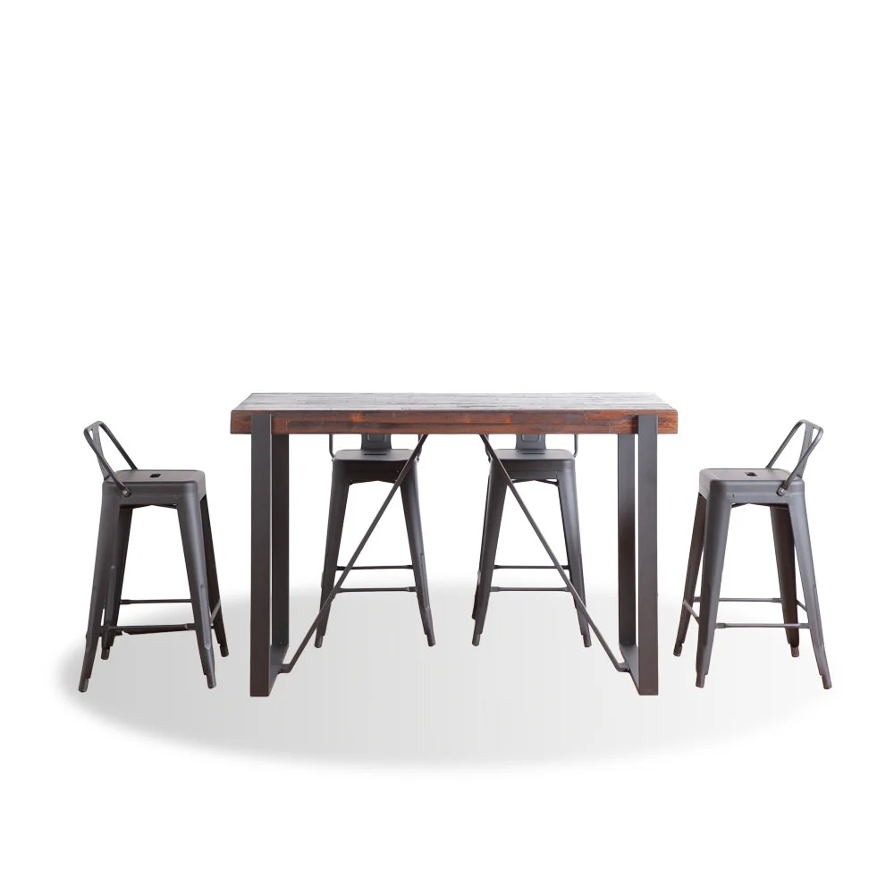 An Industrial bar set. Wood dining table top in MDF with pine wood veneer table top and square bar metal legs. Dining chairs comes in four pieces black metal splat back chair.
