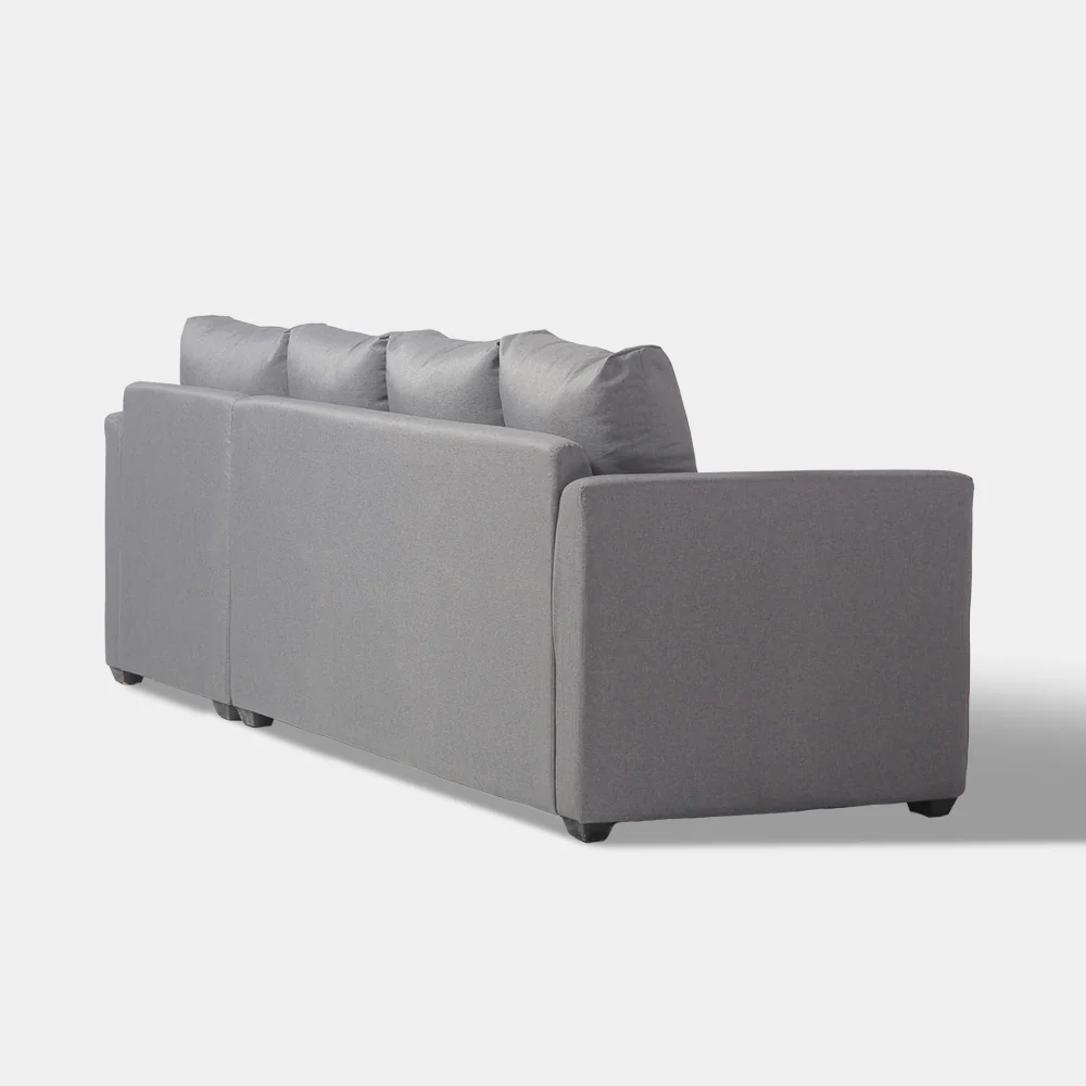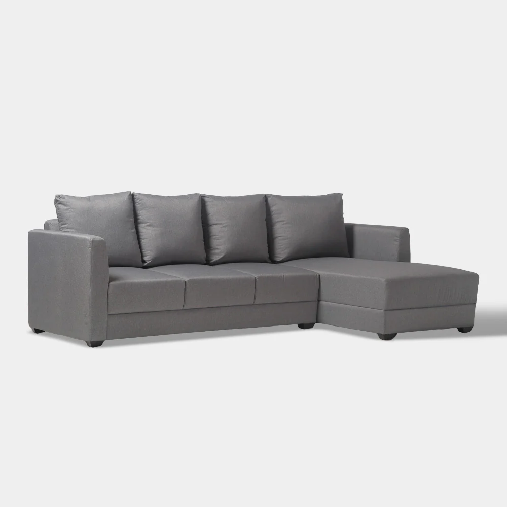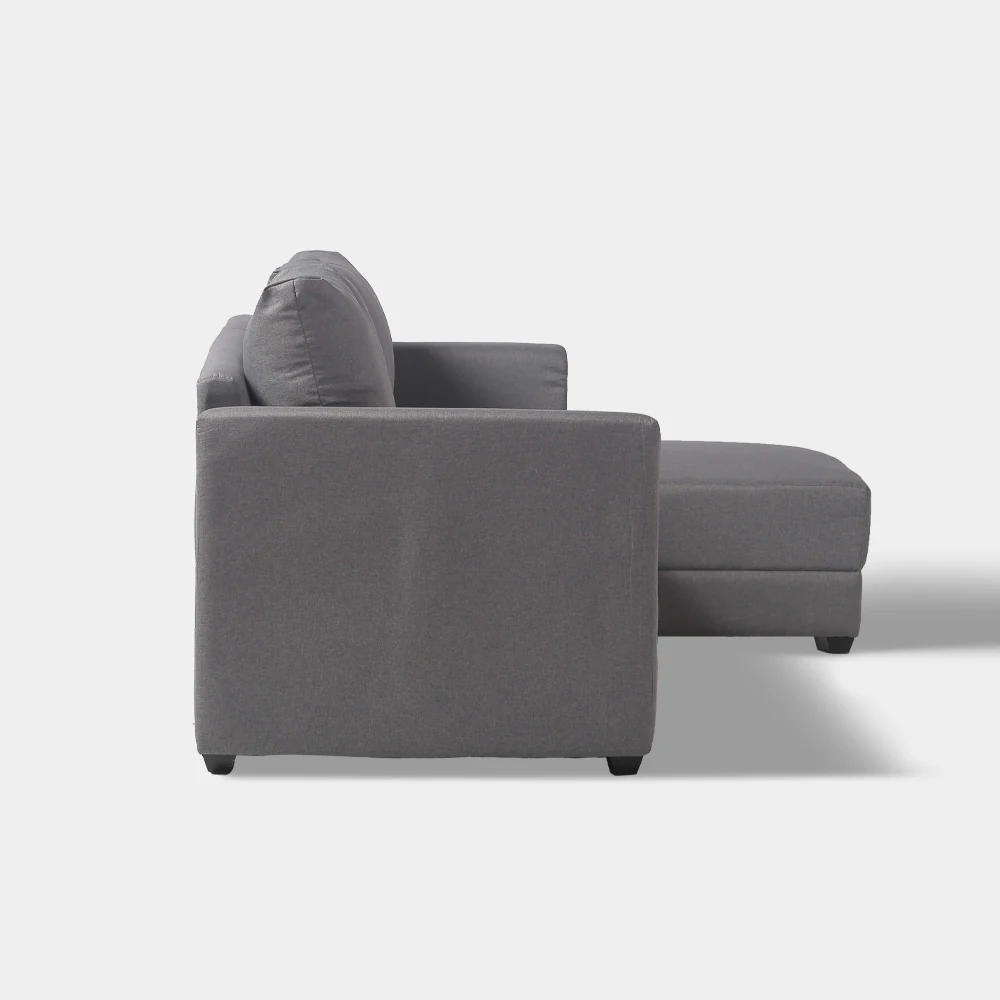 A Modern Contemporary style sectional sofa, made from solid kiln dried gmelina wood, padded in polyurethane foam and upholstered in chennile textured fabric, with black powder coated steel legs.