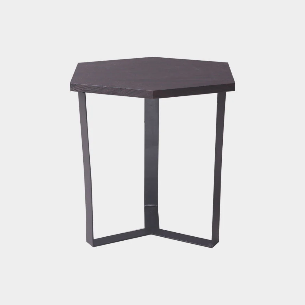 An Industrial hexagonal side table made from medium density fiber board, laminated with imported vinyl and has metal base painted in black finish.