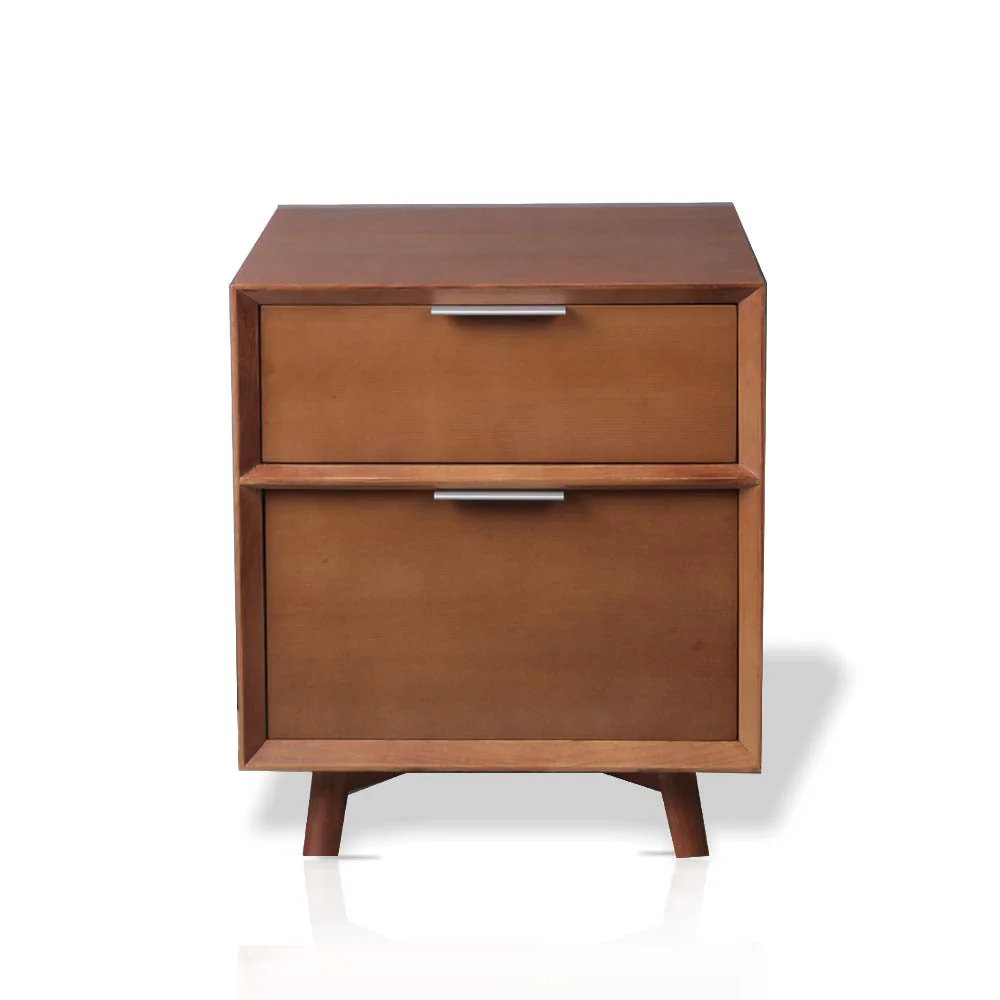 A Classic bedside table with two drawers, mitered front edges and splayed legs in solid mahogany wood and MDF.