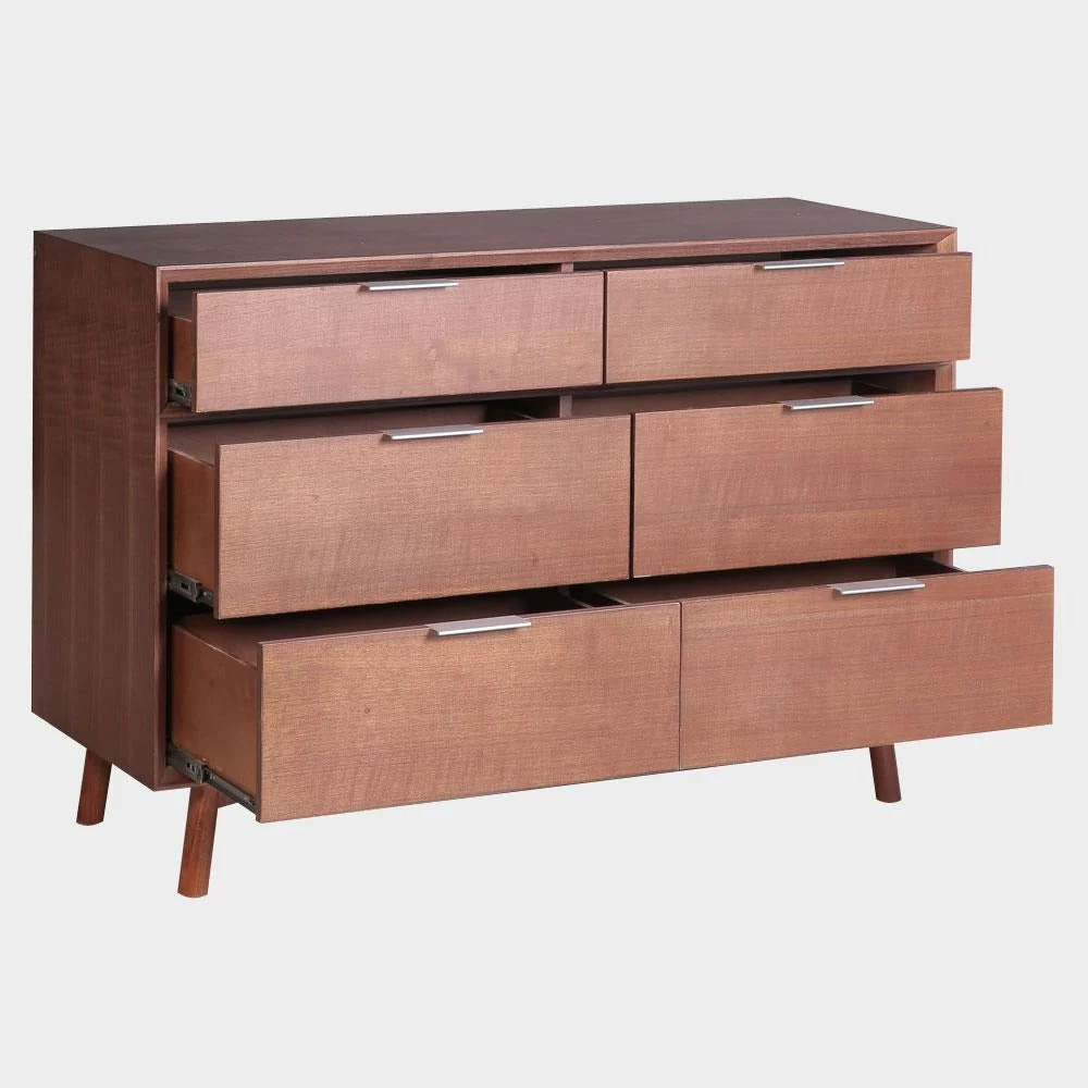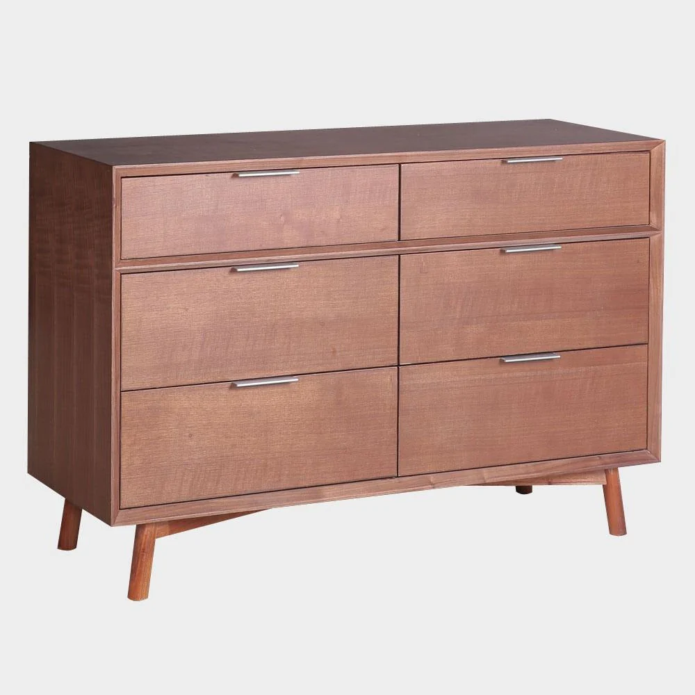 A Classic bedside table with six sliding drawers, mitered front edges and splayed legs in solid mahogany wood and MDF.