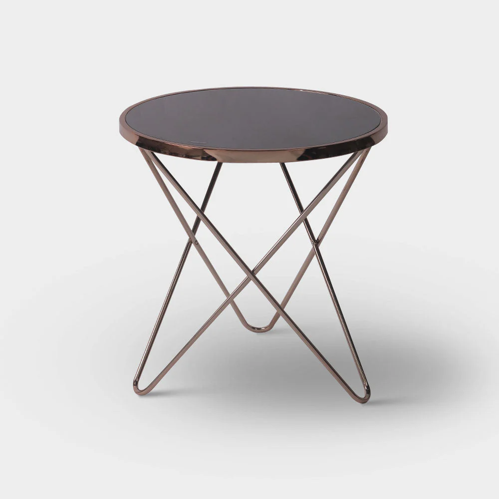 A Modern Contemporary round side table with geometric legs in champagne plating and smoke glass on top.