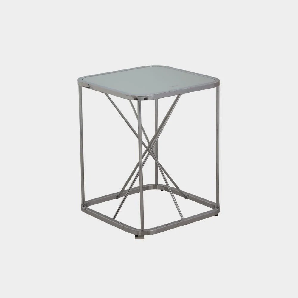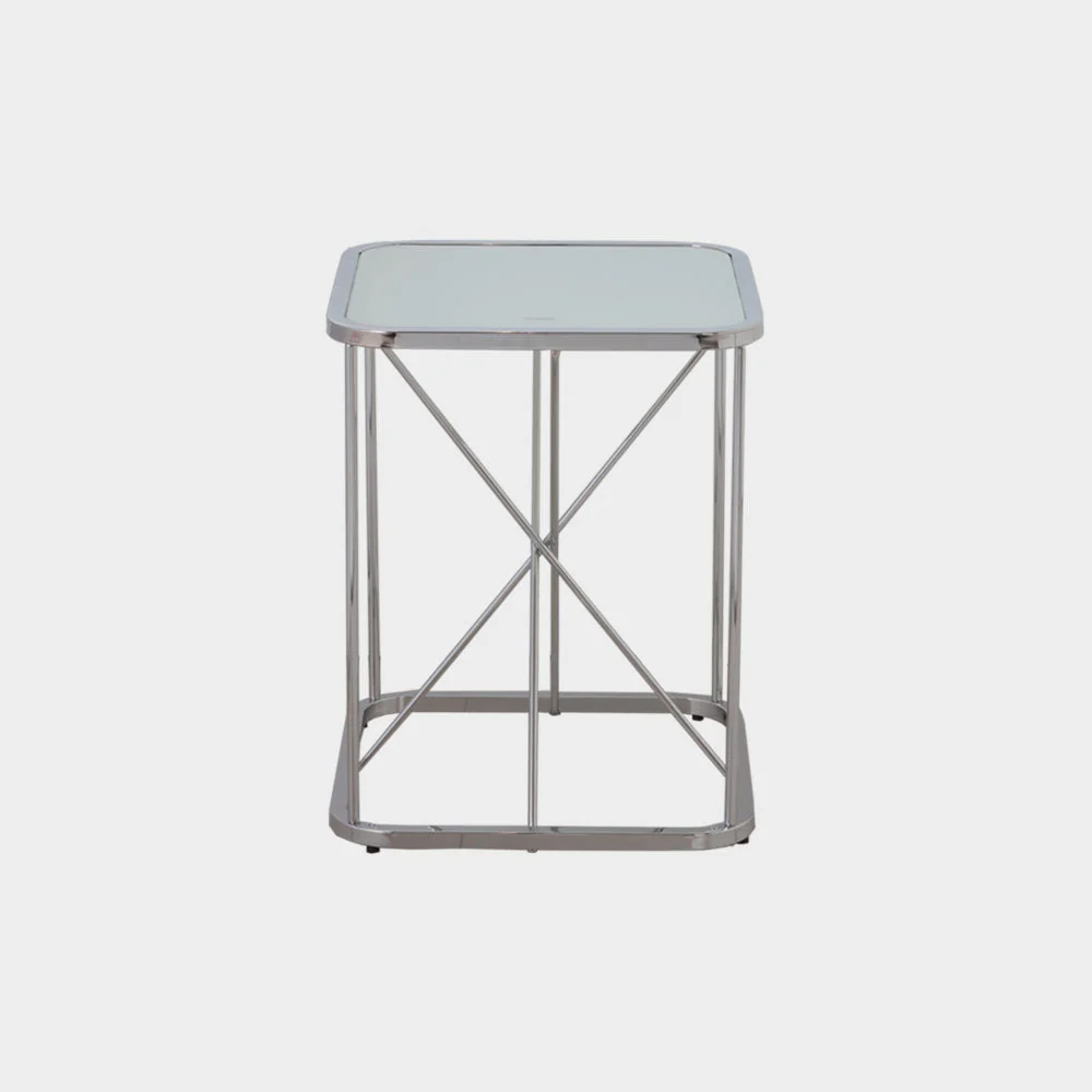 A Modern Contemporary side table made from 20mm square tube, round tube in chrome and 5mm mirror glass top.