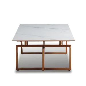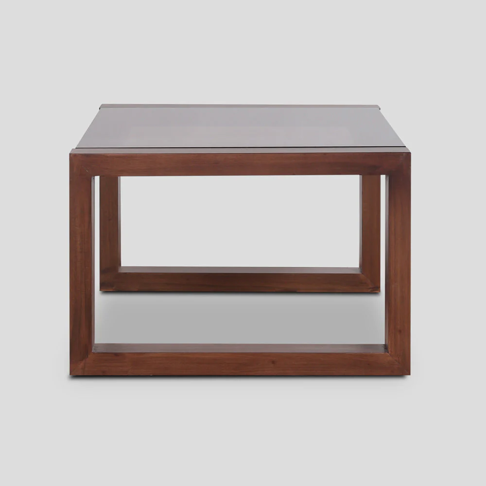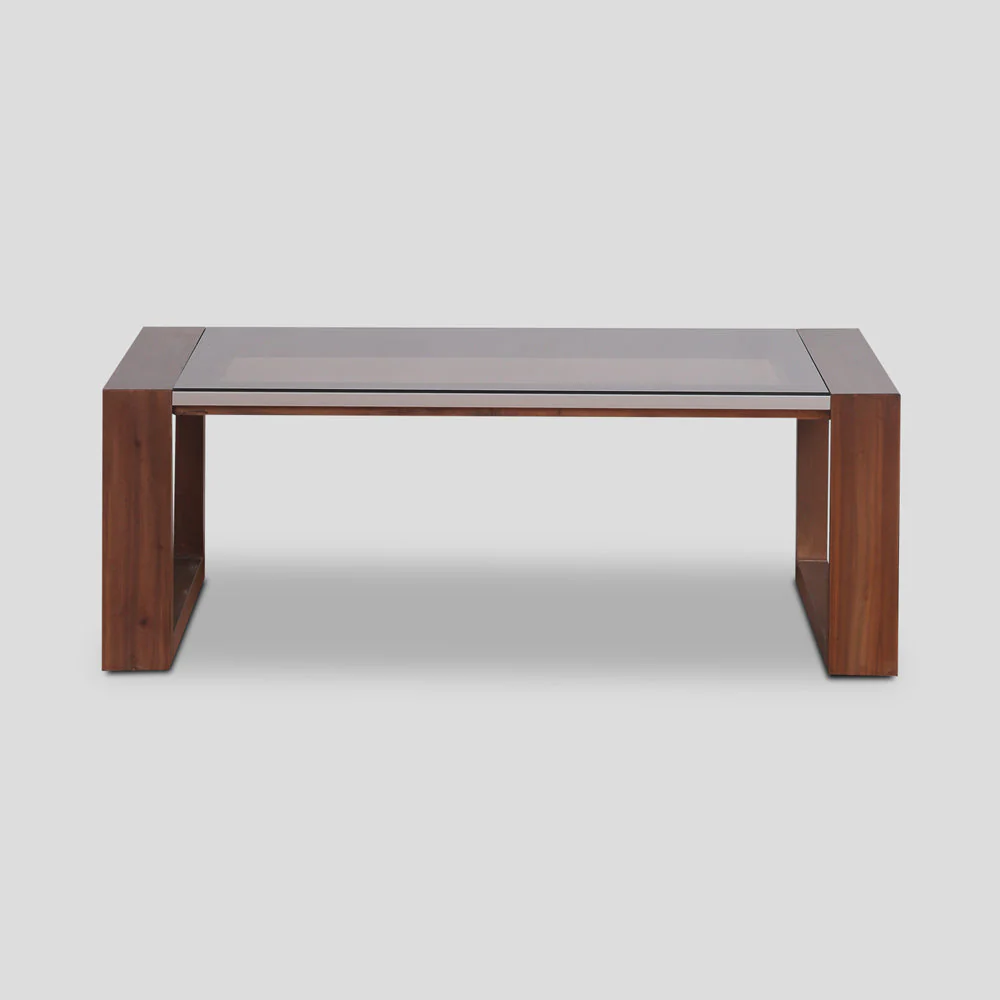 A Modern Contemporary center table made from kiln dry solid wood in stain finish, with bronze tempered glass top with aluminum edging.