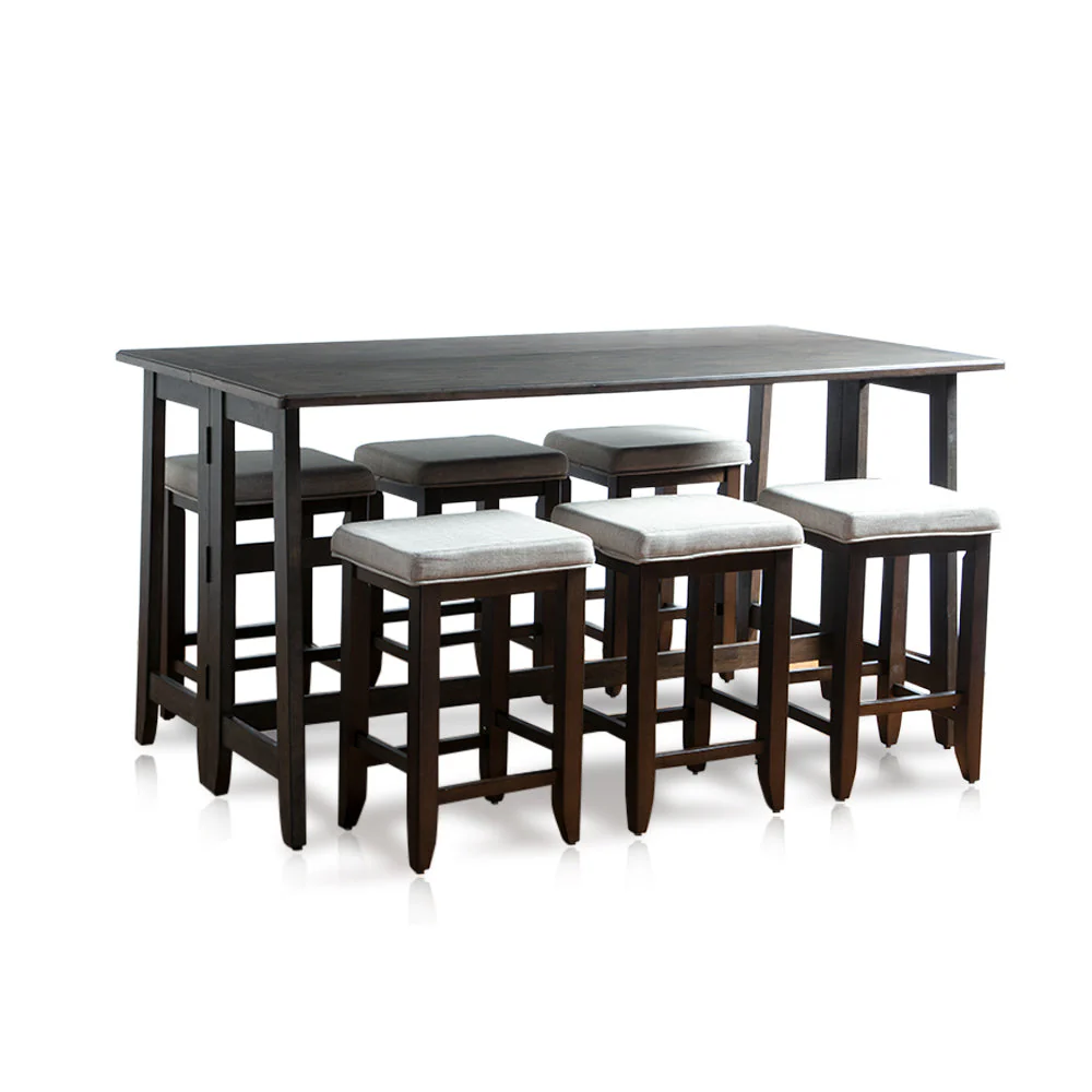 An Industrial style bar set in antique brown, bar stool seats upholstered in fabric.