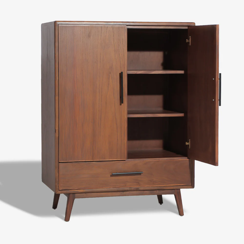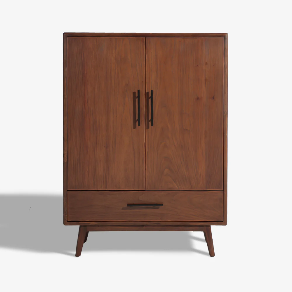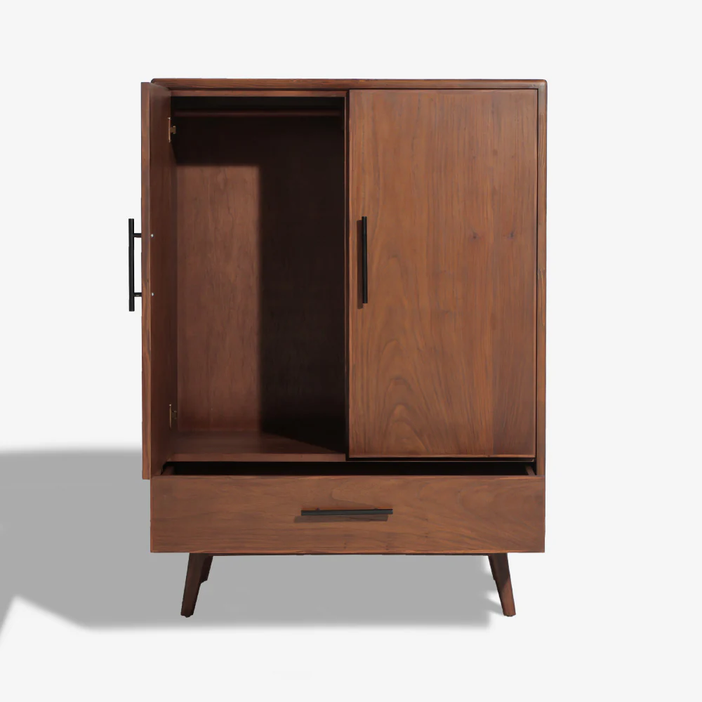A Mid-Century Modern wardrobe made from composite oak, narra, kiln dried pinewood and solid wood footings.