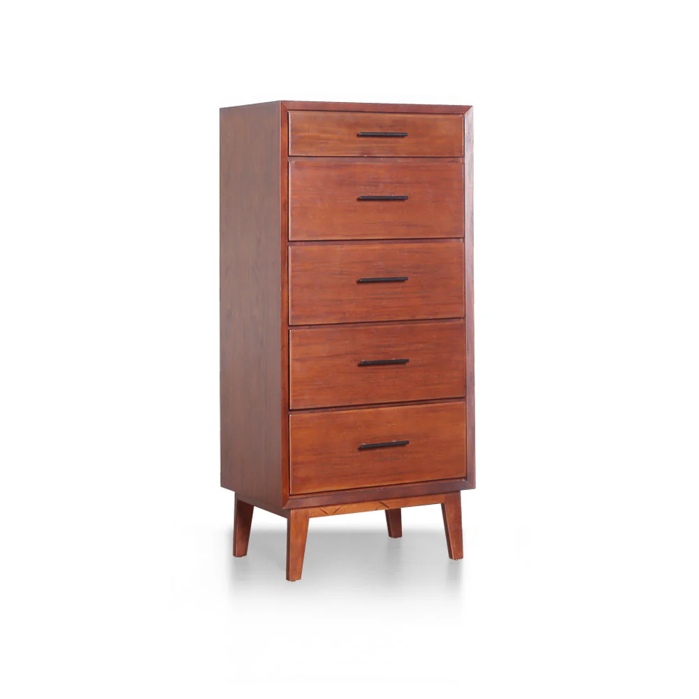 A Mid-Century Modern chest of drawers tabler made from composite oak, narra, kiln dried pinewood and solid wood footings.