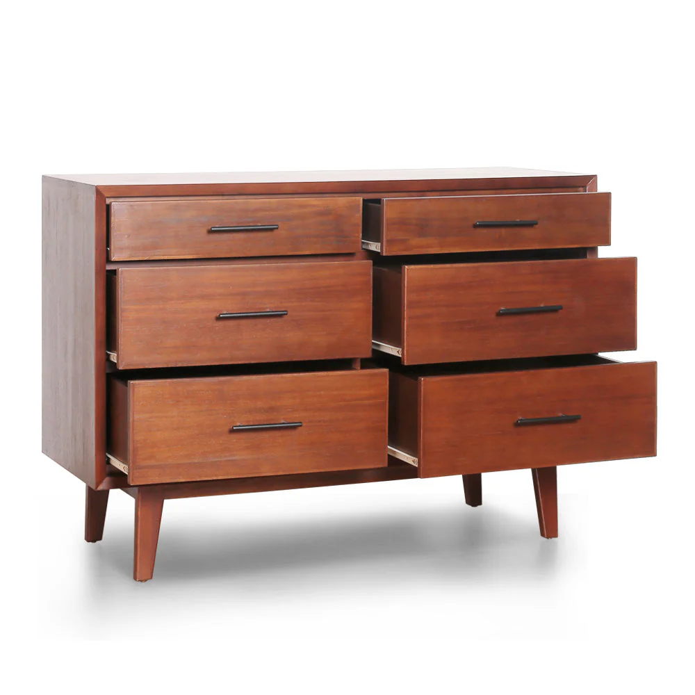 A Mid-Century Modern chest of drawers tabler made from composite oak, narra, kiln dried pinewood and solid wood footings.