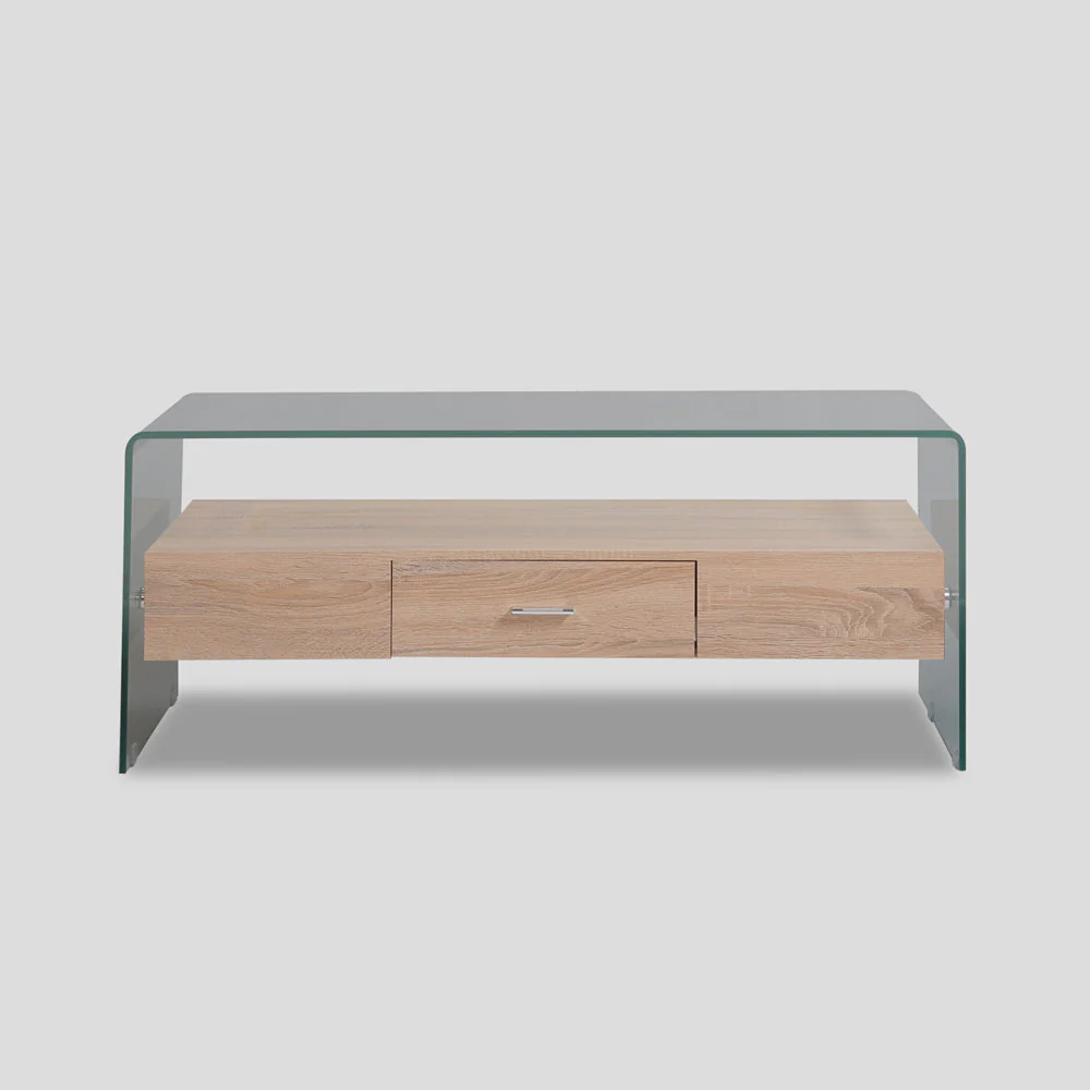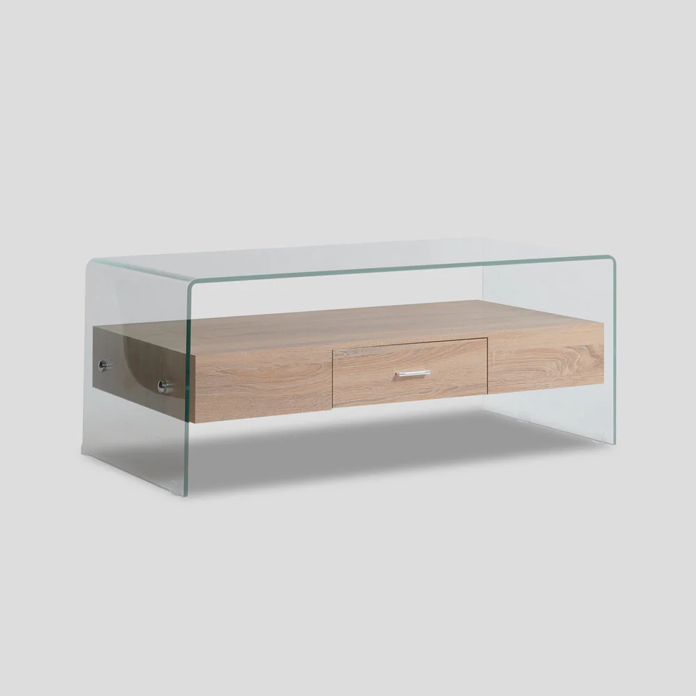 A Scandinavian style center table with one drawer, clear tempered glass top and legs, medium density fiber board body in laminate finish.