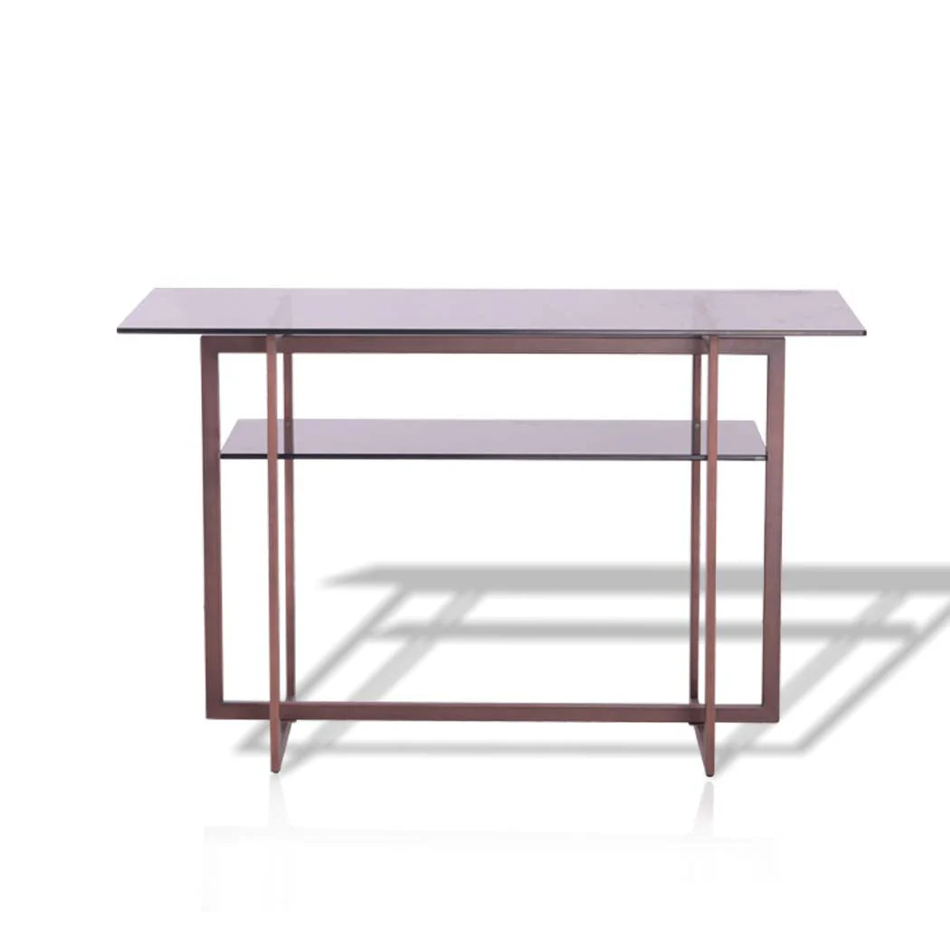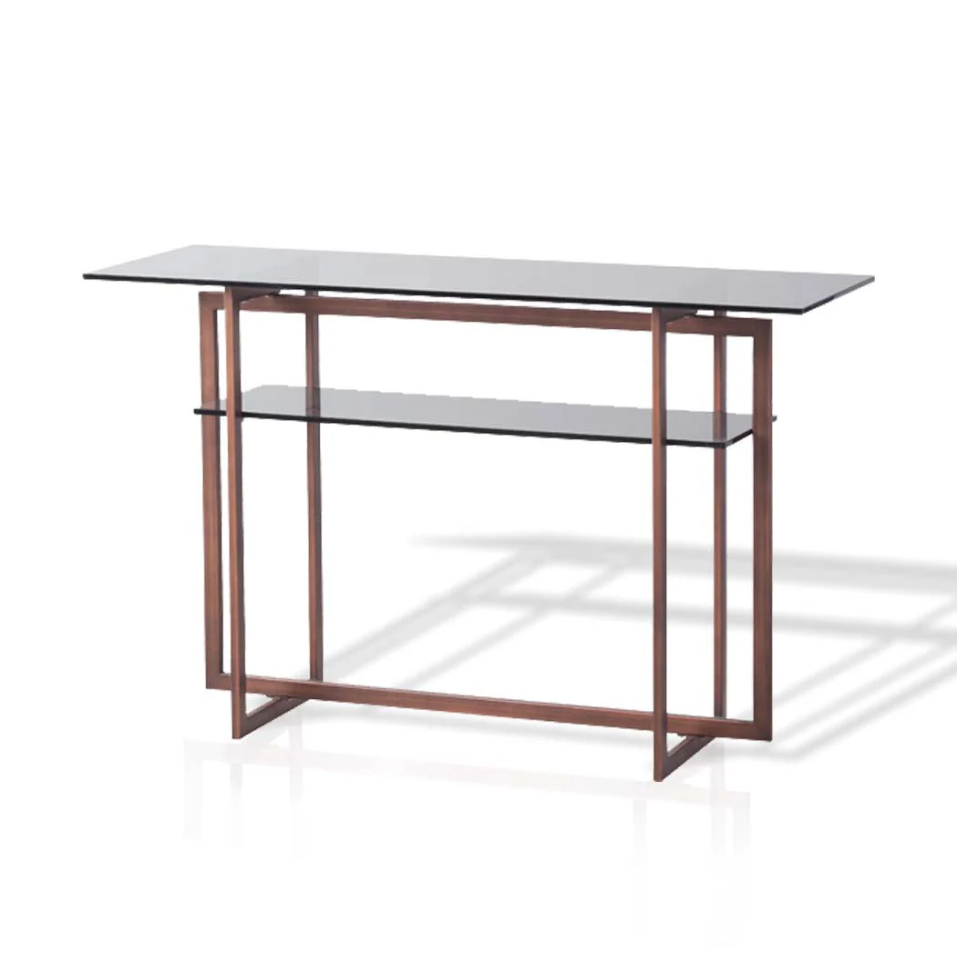 A Modern Contemporary style console table made with red bronze metal and brass framing and tempered smoke glass table top and shelf.