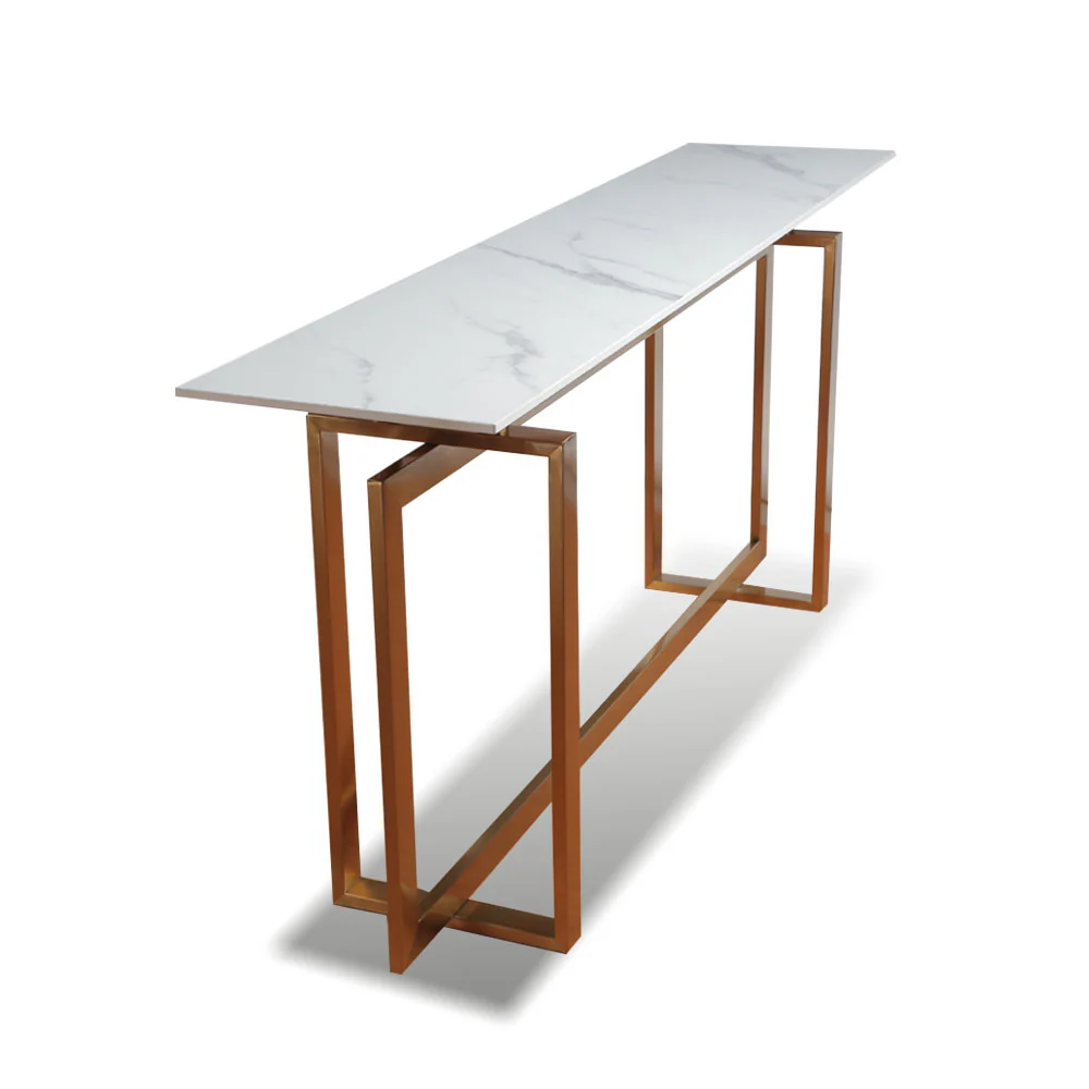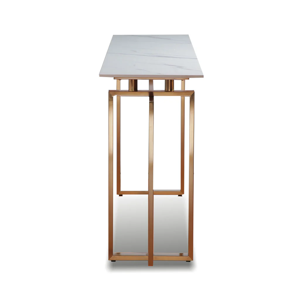 A Modern Contemporary style console table with stainless steel legs in brushed plated gold finish and 12mm thick solid white ceramic table top.