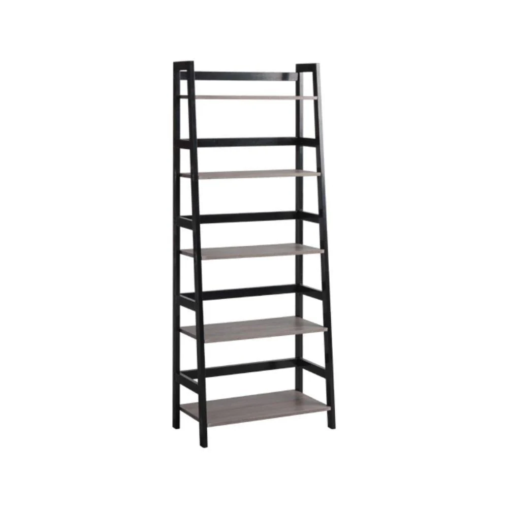An Industrial style shelf with 5 layers made from particle board with powdercoated metal framing.