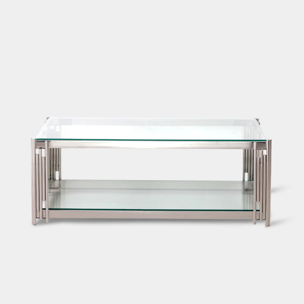 A Modern Contemporary take on an art deo inspired console table clear tempered glass top with metal chrome legs in silver finish.
