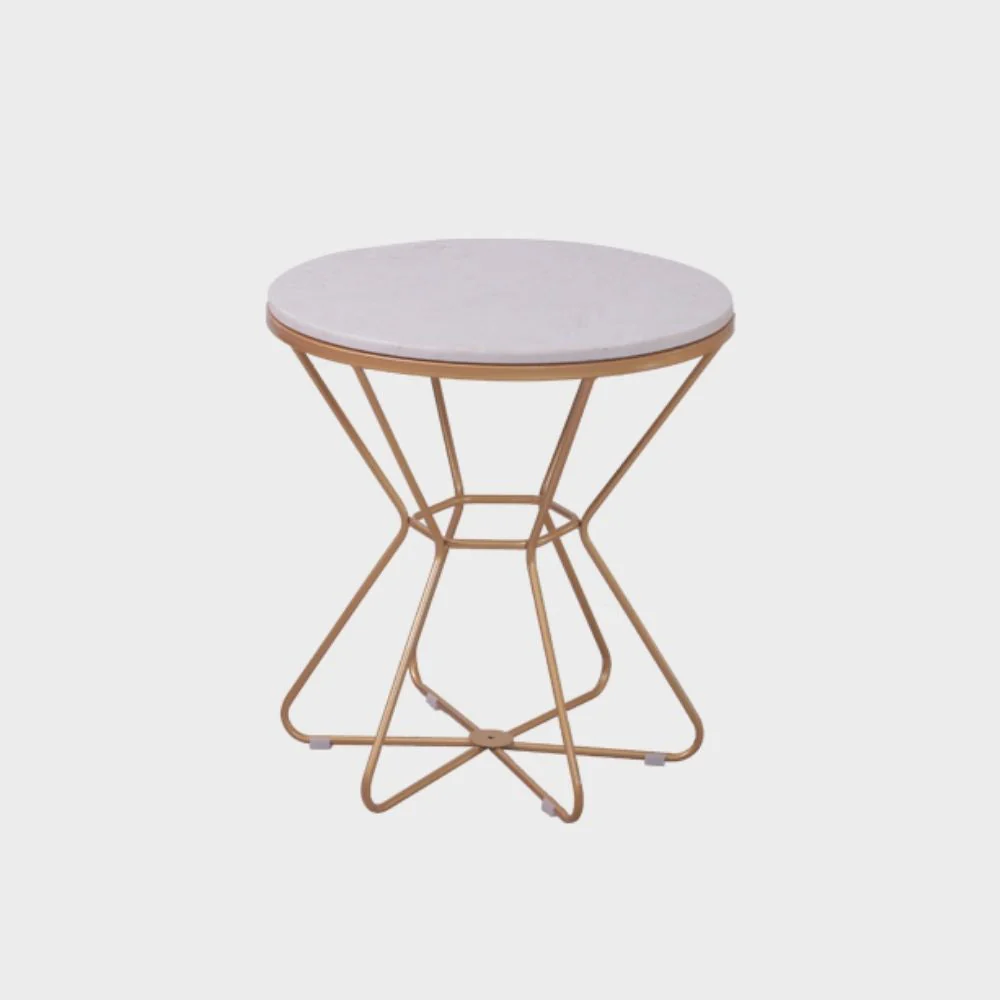 A Modern Contemporary style side table with gold metal base with white marble top.
