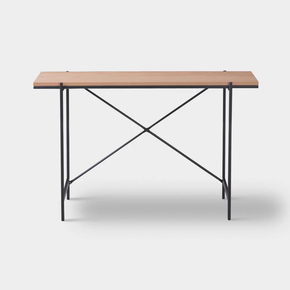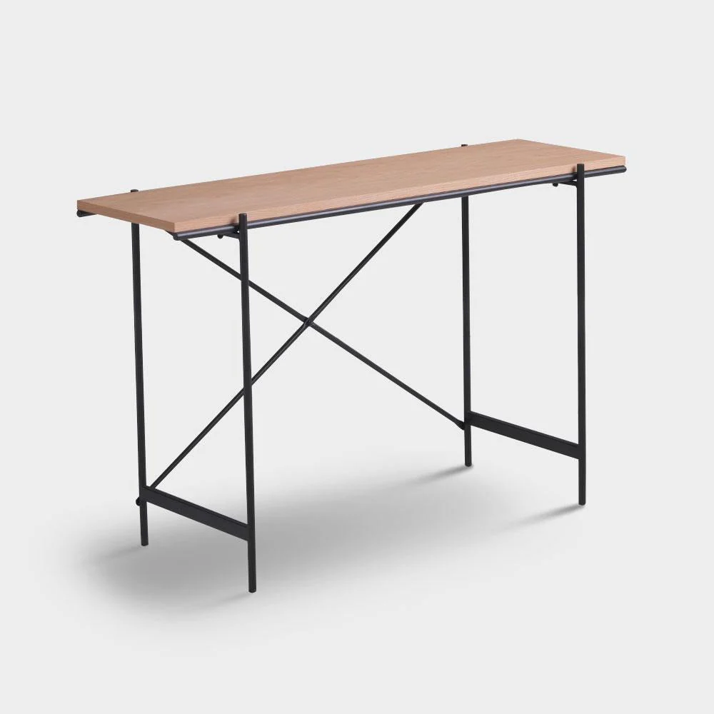 A Scandinavian console table with natural veneer table top and powder coated metal legs.
