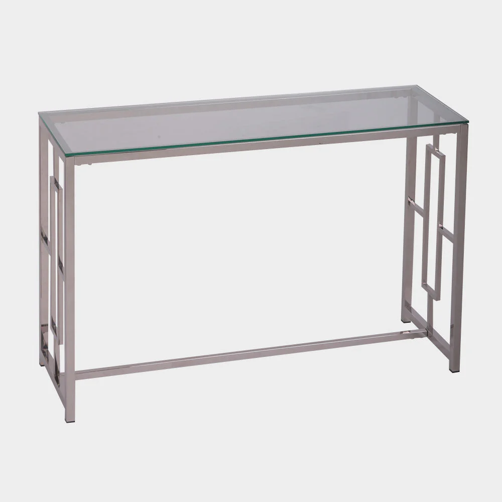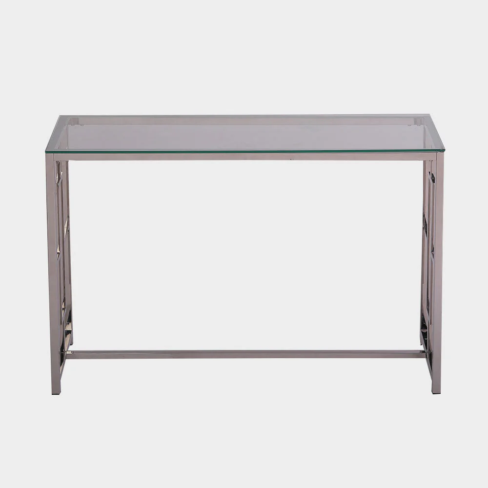 A Modern Contemporary console table inspired by a lattice pattern. Clear tempered glass with metal chrome legs in silver finish.