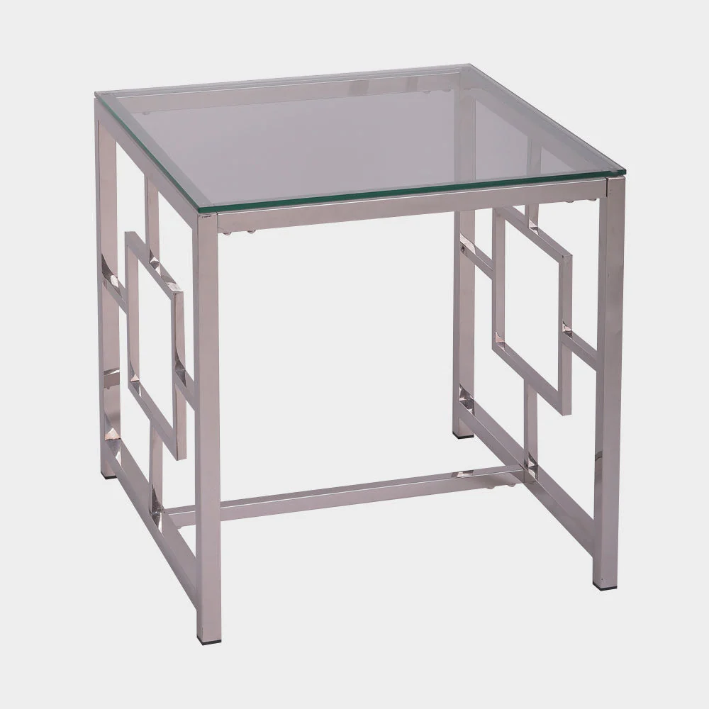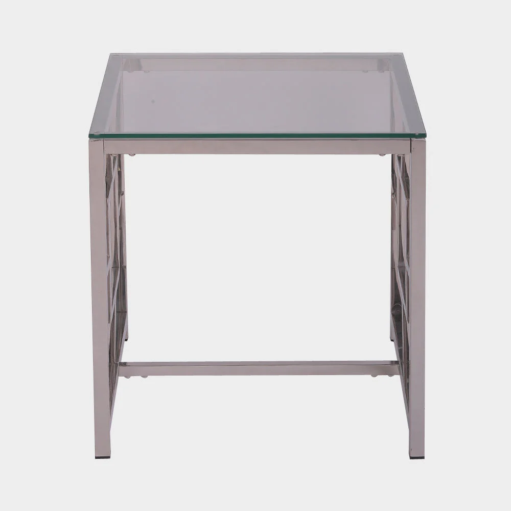 A Modern Contemporary side table inspired by a lattice pattern Clear tempered glass with metal chrome legs in silver finish.