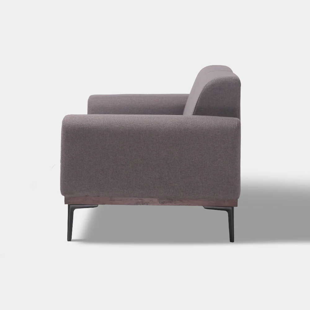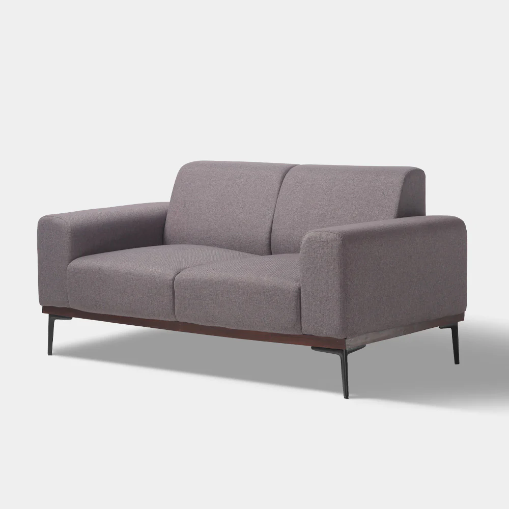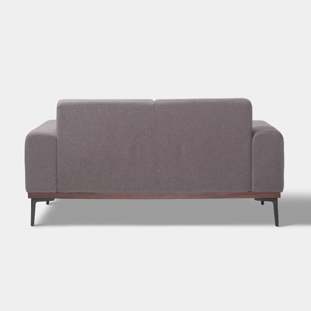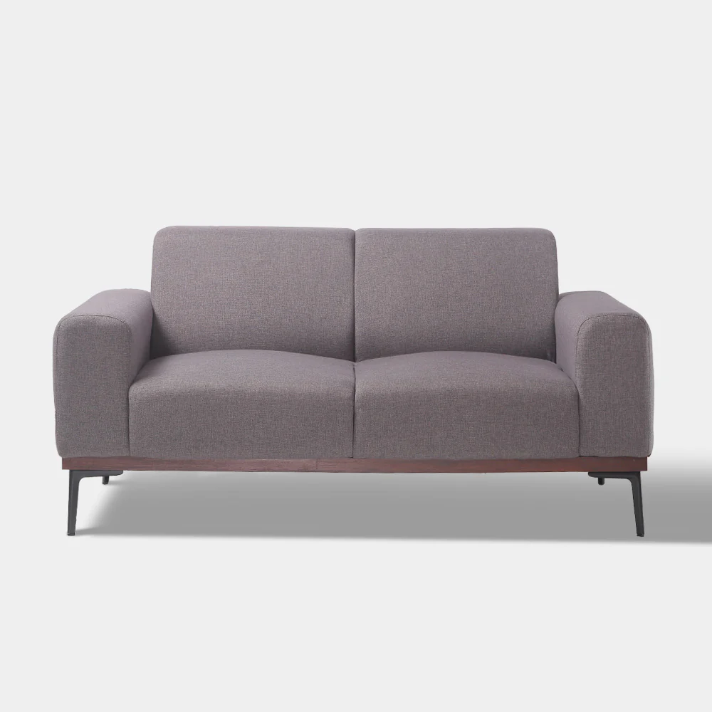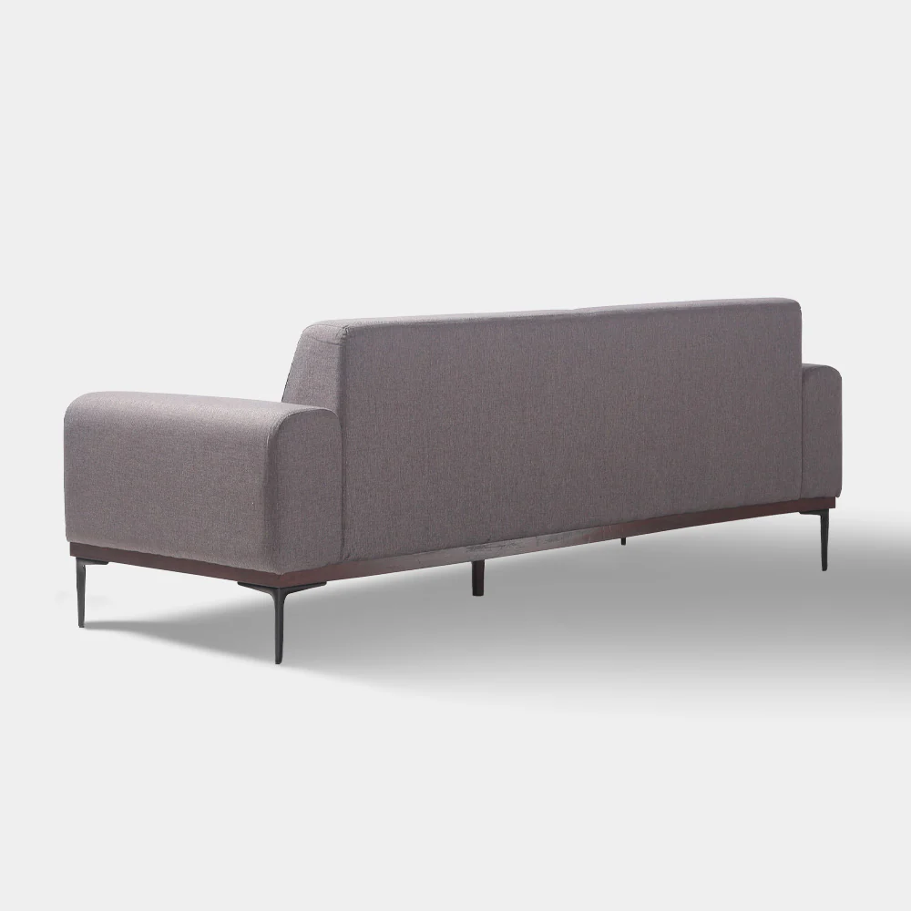 A Mid-Century Modern sofa upholstered in fabric padded with polyurethane foam, constructed from mahogany wood with metal legs.
