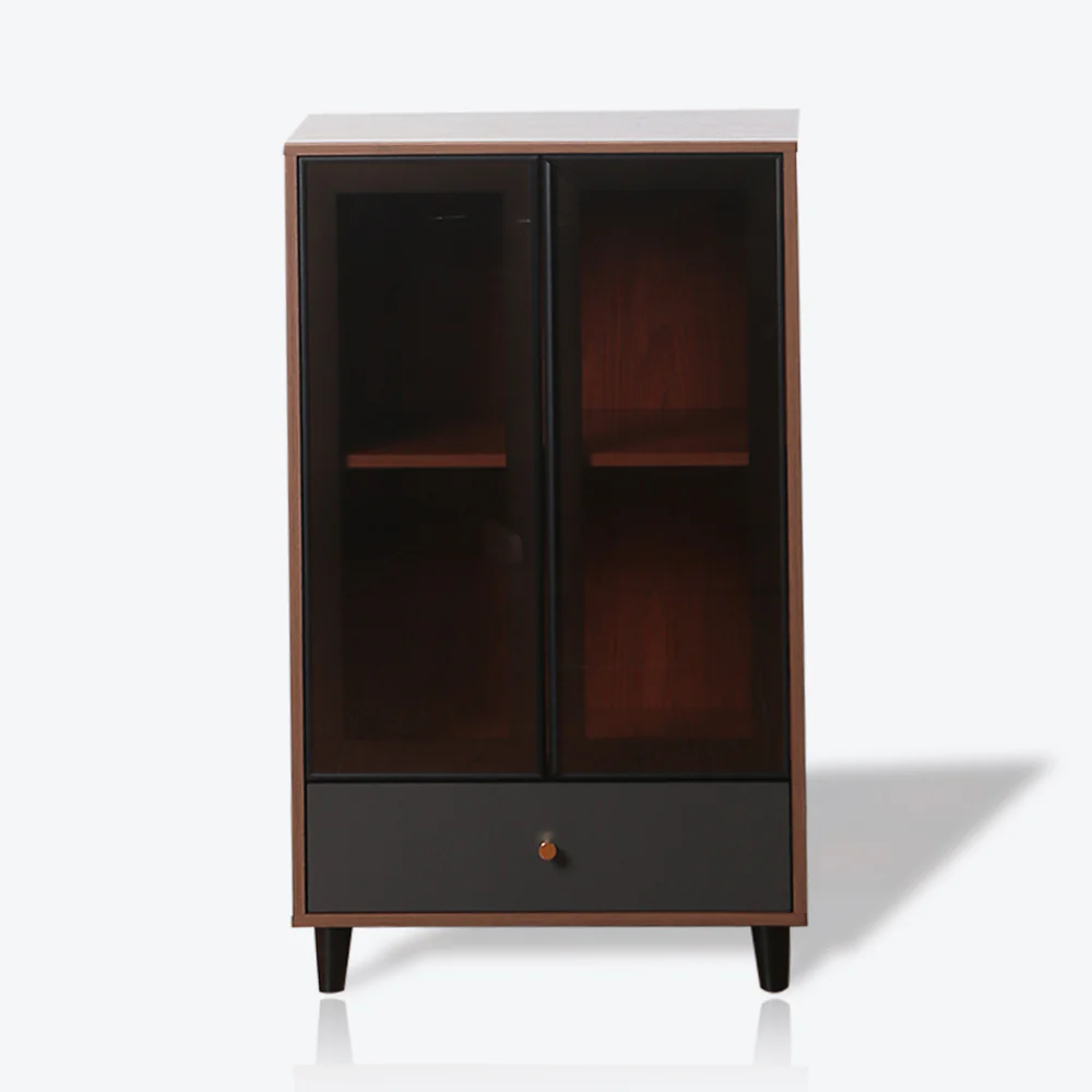 A Mid-Century Modern style bookshelf made from MDF in melamine finish, with 2 swing doors in tempered glass, with 1 drawer and motion sensor light.