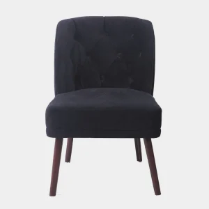 A Classic accent chair upholstered in fabric padded foam with curved tufted back rest and tapered legs constructed from plywood and mahogany. Size: L56xW80xH82 cm Weight capacity: 90 kg