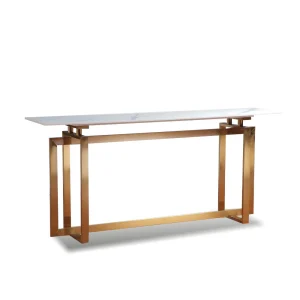 A Modern Contemporary style console table with stainless steel legs in brushed plated gold finish and 12mm thick solid white ceramic table top. Size: L180xW40xH81 cm