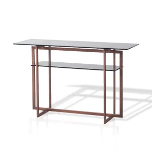 A Modern Contemporary style console table made with red bronze metal and brass framing and tempered smoke glass table top and shelf. Size: L120xW40xH75 cm