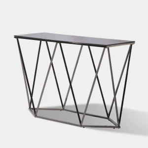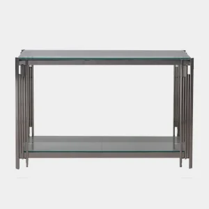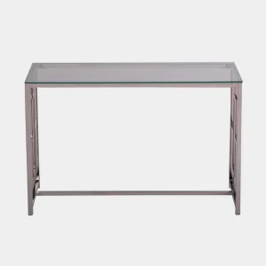 A Modern Contemporary console table inspired by a lattice pattern. Clear tempered glass with metal chrome legs in silver finish. Size: L120xW40xH78 cm