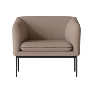 This inviting armchair has a strict sculptural outer shape that complements the curves of the inviting, rounded inner. With its tight upholstery and simple frame made from powder coated steel.